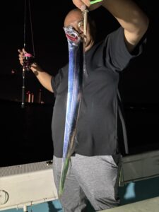 まず、タチウオですがポイント到着するなり ヒットしアタリはずっとありました☺️型は指3本半前後が多かったですがアタリはずっとある感じでした。テンヤはアクアウェーブさんのスパークテンヤ8gに同メーカーのアシストフック、ケミホタル37を装着して釣って頂きました!!テンヤは船のをご利用頂きました😄