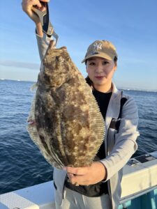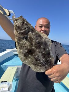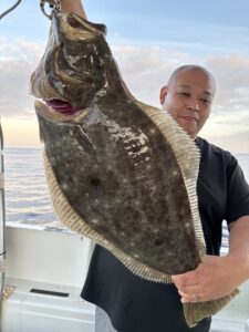 夜明けでタチウオのアタリも遠のいた所でヒラメ狙いへ!!これまた開始直後ナイスサイズの81センチ。肉厚半端ない。大アジで1撃でした。その後も大アジのエサで2匹追加してからはしばらくアタリ出てましたが針に掛からず。下潮に入り急にトーンダウン。アタリもなくなってしまいお客様の氷がなくなり早上がりにしました🙇♂️