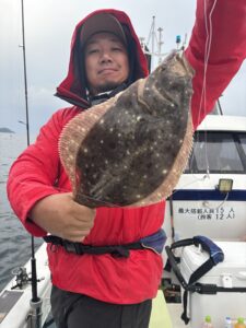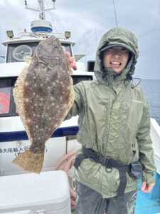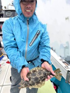 出船時から本降りの雨降り続き震えながらもヒラメ狙いへ。ポイント転々とするもこちらも潮全く動かず拾い釣りで何とか顔みれました。