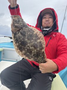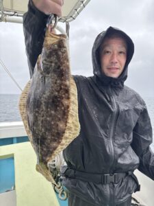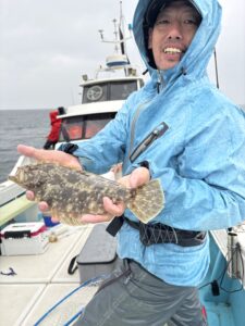 出船時から本降りの雨降り続き震えながらもヒラメ狙いへ。ポイント転々とするもこちらも潮全く動かず拾い釣りで何とか顔みれました。